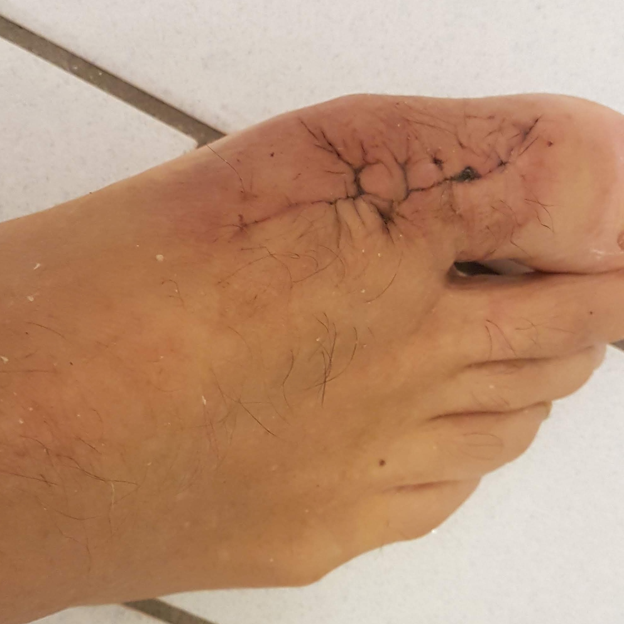 Lägeskontroll två dagar efter operationen. Allt ser fint ut! Det fanns inget friskt brosk kvar i leden mellan stortån och foten. Hallux rigidus med helt stel led. Läkaren berättade att han forskat och publicerat kring bedövning och smärtlindring vid just denna typ av operation och hans rön används i hela världen. Det ligger en blockad av nerverna fortfarande. Den blockaden gör att jag knappt har ont fastän han kört i två skruvar rätt genom tån. Fantastiskt! Och själva operationen var också en bra upplevelse. Den gick fort. Jag lyssnade på Petra Månströms maratonpodden för att slippa höra otrevliga ljud.